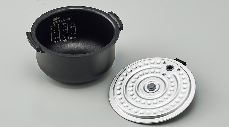 お手入れが必要な部品は、内ぶた・蒸気口ユニットと内釜の2点。取りはずして丸洗いができるのでお手入れがラクです。