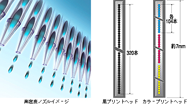 幅広い面積を一気に印刷できる、計632本の高密度ノズル方式を採用。カラー8枚/分、モノクロ12枚/分という快速プリントを実現しました(速度優先モード時)。 |