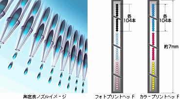 AJ-2100では、幅広い面積を一気に印刷できる各色104本(合計624本)の高密度ノズル方式を採用。6色カラー印刷もモノクロ印刷も8枚/分の快速プリントを実現しました(速度優先モード時)。 |