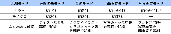 | 緻密なデータのプリントも速い。印刷モード別スピード一覧 |