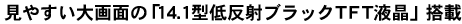 パネル面の外光反射を大きく抑えた「低反射ブラックTFT」液晶。明るい場所でも画面の黒がしまり、文字はクッキリと、画像もひときわ色鮮やかに表示。コンテンツの魅力を余すところなく伝えるとともに、さまざまなアプリケーションの快適操作をサポート。 もちろん、モバイルでも見やすいメビウスだけの美しいハイクォリティ液晶です。