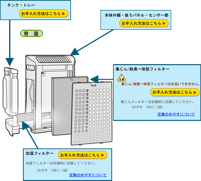 フィルターお手入れランプが点灯したときは、加湿フィルター、後ろパネルをお手入れしてください。