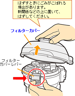 フィルターカバーレバーを解除方向に動かし、フィルターカバーをはずします。