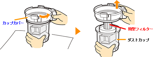 カップカバーを矢印方向に回し、カップカバーをダストカップから持ち上げて、取りはずします。