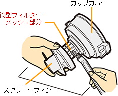 新聞などの上に、カップカバーを置き、付属のクリーニングブラシで、筒型フィルターに巻きついたごみや、スクリューフィンに付着したごみなどを取り除きます。※筒型フィルターのメッシュ部分をお手入れするときは、付属のクリーニングブラシで、やさしくこすってください。