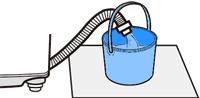 バケツを排水ホースの先に当てがいながら「排水ホースをホース掛けからはずし、出てきた液をバケツで受け、バケツが一杯になったら、排水ホースをホース掛けに掛ける」を繰り返します。