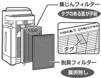 - 集じんフィルター(厚みのある方)は、タグのある面を手前に取り付けてください。