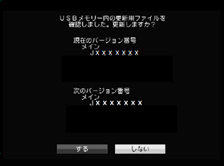4. 本機ソフトウェアの現在のバージョンと、USBメモリー内の更新データのバージョンが表示されます。