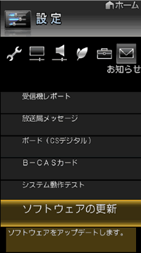 リモコンの[ホーム]ボタンでホームメニューを表示させ、「設定」-「(お知らせ)」-「ソフトウェアの更新」を選びます。
