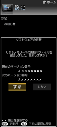 更新データを使って本機のソフトウェアを更新するには、リモコンカーソルボタンで、画面に表示された[する]を選んで、[決定]ボタンを押します。