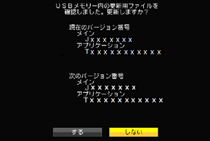 本機ソフトウェアの現在のバージョンと、USBメモリー内の更新データのバージョンが表示されます。 更新データを使って本機のソフトウェアを更新するには、リモコンカーソルボタンで、画面に表示された[する]を選んで、[決定]ボタンを押します。