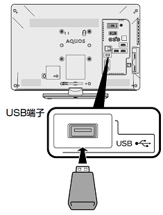 本機のUSBメモリー端子に、更新用ソフトウェアを書き込んだUSBメモリーを取り付けます。