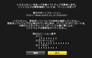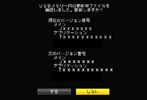 本機ソフトウェアの現在のバージョンと、USBメモリー内の更新データのバージョンが表示されます。