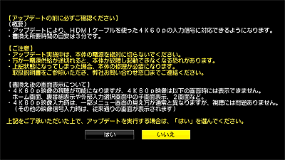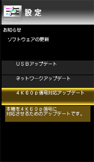 リモコンのメニュー(設定)ボタン〔下部のフタの中にあります〕を押し、「(お知らせ)」-「ソフトウェアの更新」-「4K60p信号対応アップデート」を選んで、[決定]ボタンを押します。