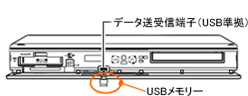 BDレコーダー(以下、本機といいます)の電源を切った状態で、本機本体前面のデータ送受信端子に、更新用ソフトウェアを保存したUSBメモリーを取り付けます。