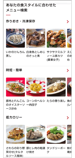 11種類の食スタイルのテーマから気になるテーマを選ぶと、その食スタイルにあったメニューを簡単に検索できます。
