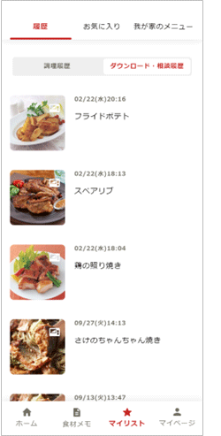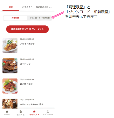 機器連携すると、メニューの調理履歴やダウンロード・相談履歴の一覧を確認できたり、お気に入り登録したレシピを確認できます。
