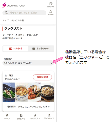 - クックリスト画面を開き、機器選択でクックリストを登録したい機器を選びます。