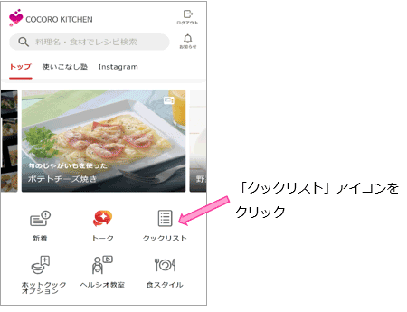 ホーム画面の「クックリスト」アイコンをクリックすると、クックリスト画面を表示します。