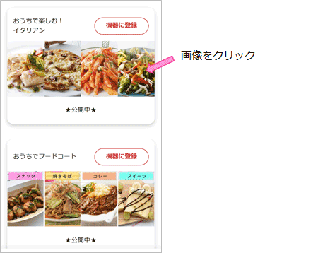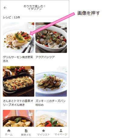 各メニューの画像を押すと、レシピ詳細画面を表示します。