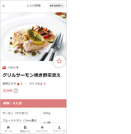 ○ | 無 | × クックリストから1メニューを 選んで機器に送信可能 |