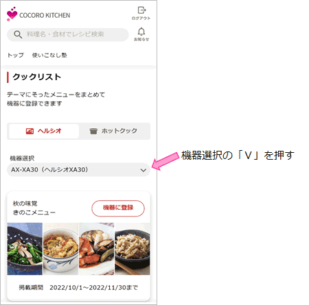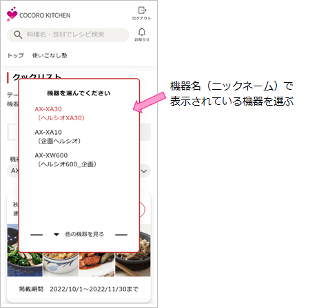 機器選択の「V」を押すと、クックリストに対応している機器を表示します。