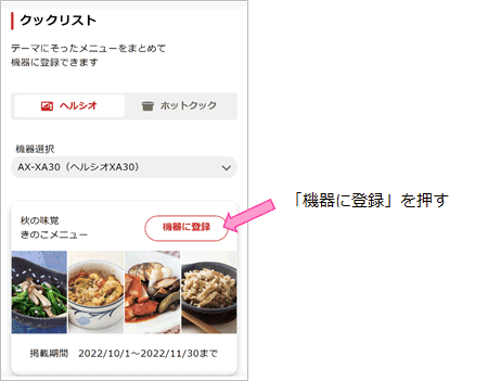 機器登録しているAIoT対応のヘルシオに、テーマごとのクックリストをまとめて登録できます。