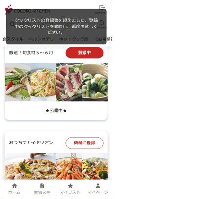 クックリストの機器登録上限数を超えて、新たに登録したいクックリストの「機器に登録」ボタンを押すと、「クックリストの登録数を超えました。登録中のクックリストを解除し、再度お試しください。」というメッセージを表示します。