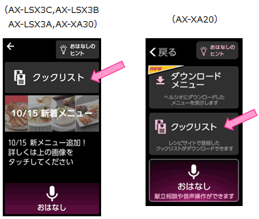※ヘルシオ AX-LSX3C、AX-LSX3B、AX-LSX3A、AX-XA30、AX-XA20は、3つのクックリストを同時に機器に登録できます。