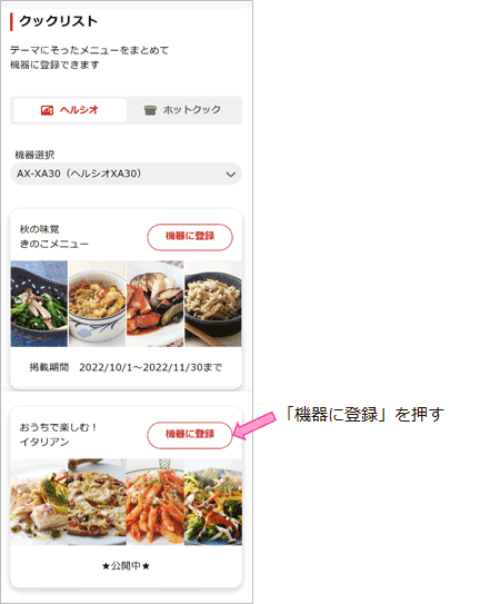- 新しく登録したいクックリストの「機器に登録」ボタンを押します。