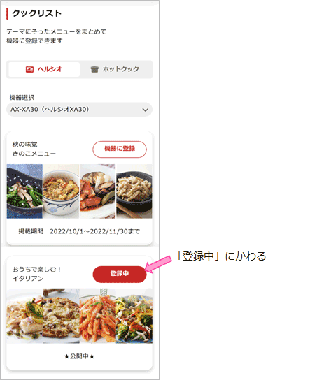 - 登録済みクックリストの「登録中」ボタンを押すと「機器に登録」に表示が変わります。これで登録は解除されます。