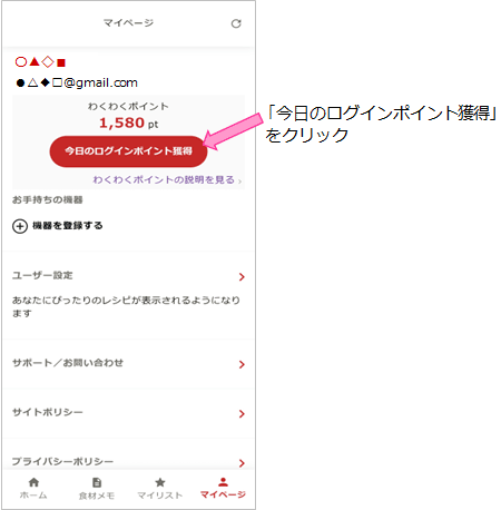 COCORO MEMBERSで設定した「COCORO ID」でログインし、COCORO KITCHENを開くと、毎日1回「わくわくポイント」を獲得できます。