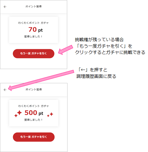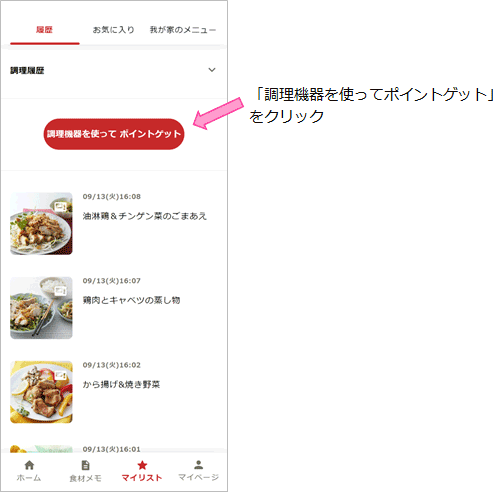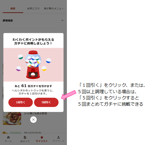 調理後、マイリストの調理履歴画面を開き「調理機器を使ってポイントゲット」ボタンをクリックしてガチャに挑戦してください。