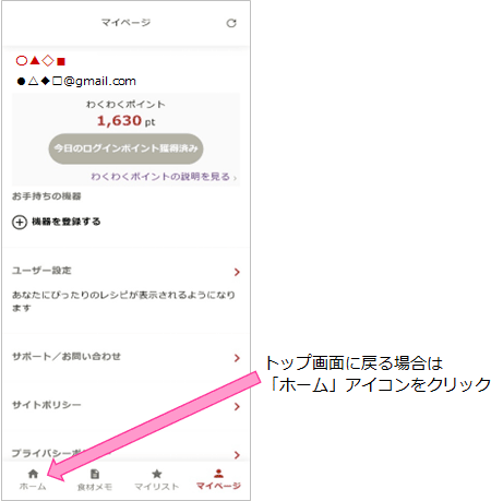 - COCORO KITCHENを開き「マイページ」アイコンをクリックし、マイページを開きます。