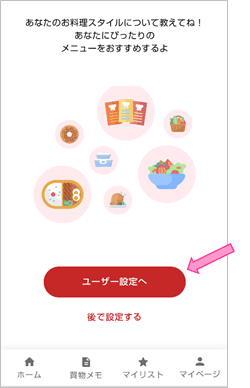- あなたのお料理スタイルを入力いただくため、「ユーザー設定へ」を押してください。