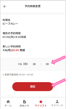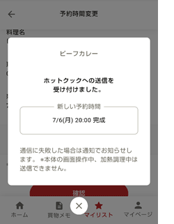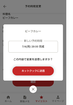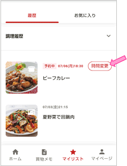マイリスト「調理履歴」の予約調理中のメニューから「時間変更」を押してください