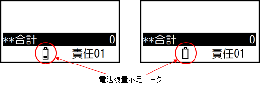これらの表示をした場合でも、レジは継続して使用できます。しかし、内蔵電池の電圧が極端に低い状態のため、レジの電源プラグがコンセントから抜けたり、停電が発生した場合には、メモリーが保持できなくなり、電子レジスタが誤動作をする可能性があります。