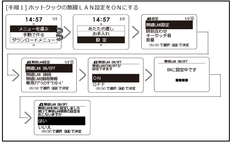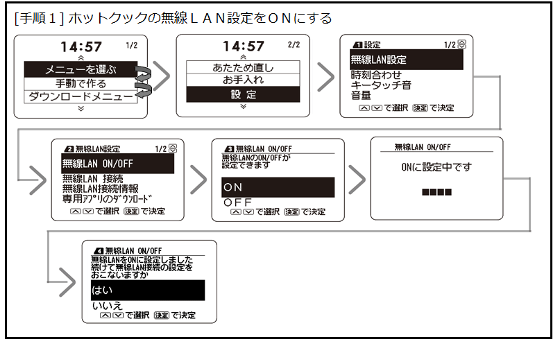 設定の途中で、ホットクックで操作する場合もあります。専用アプリの画面説明に従って操作してください。