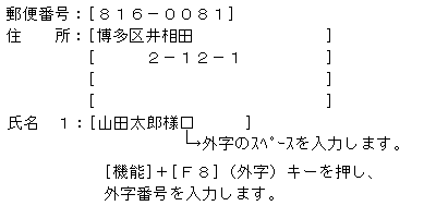 | 2. | 宛名入力画面で宛名を入力する際に「外字のスペース」を利用します。