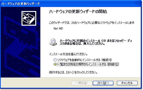 ハードウエアの更新ウィザードの画面が表示されましたら、「一覧または特定の場所からインストールする(詳細)」を選択し、「次へ」をクリックしてください。