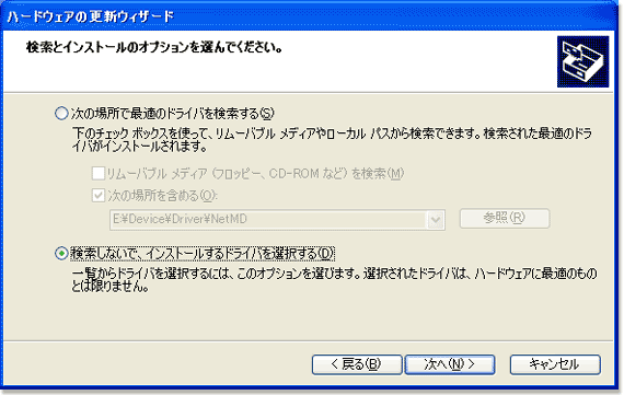 (CD-ROMドライブがEドライブの場合は、”E:\Device\Driver\Net MD”になります。)