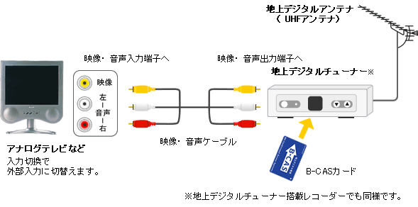 - 地上デジタル対応のブルーレイディスクレコーダー/DVDレコーダーなどを購入し、テレビの外部入力に接続し、地上デジタル放送を楽しむ。