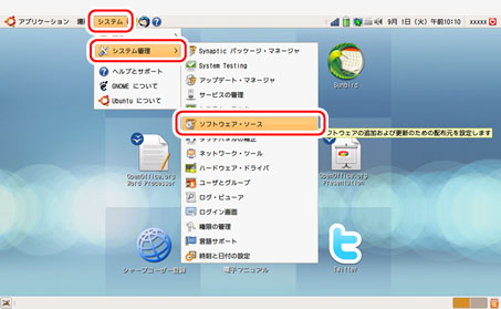 「システム」メニューをクリックし、「システム管理」−「ソフトウェア・ソース」をクリックする。