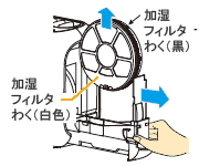 | ふだんのお手入れ | トレーフタをはずじ、水洗いする![]() ローラーとフロートははずさないでください。 はずれたときは、きちんと取り付けてください。 (加湿できません) |