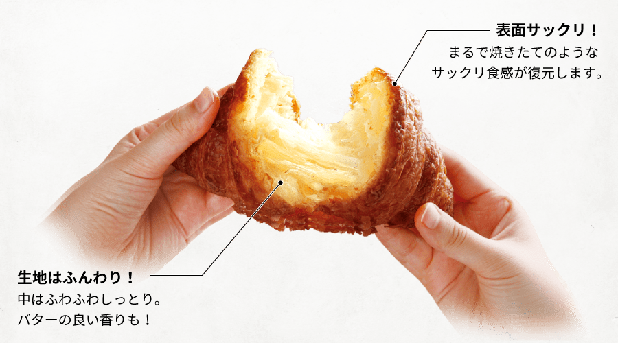 クロワッサンは時間が経ってしまうとしんなり…。でも、過熱水蒸気で表面は焦がさずサックリ、中はふんわり、まるで焼きたてのおいしさに復元できます。