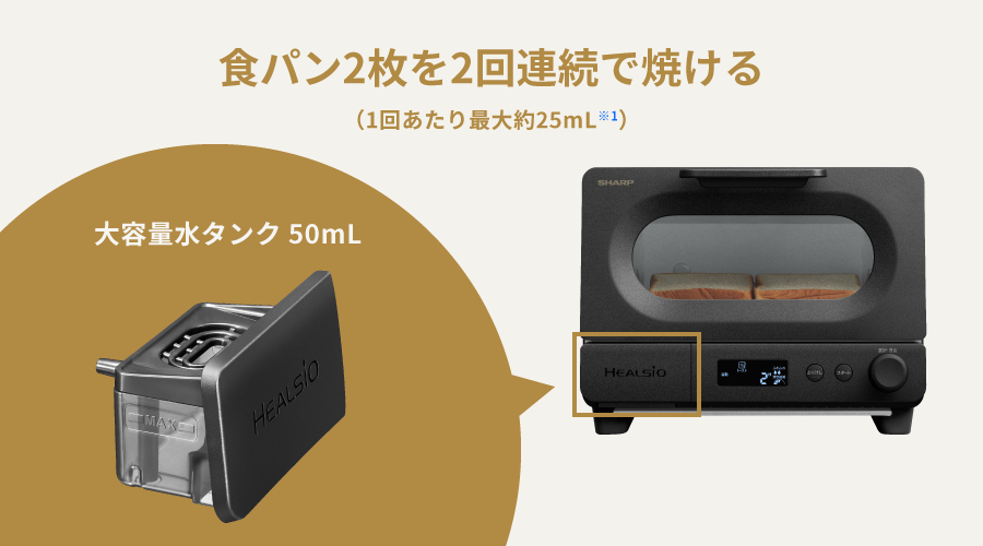 トーストは水を足さずに2枚を2回連続で加熱できます。(厚切トースト冷凍を除く)