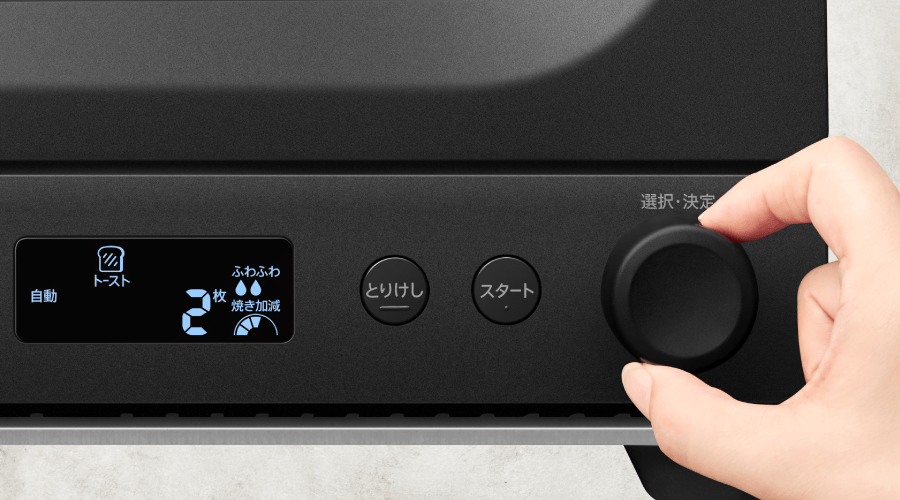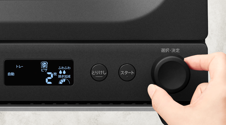 液晶表示で加熱設定が見やすく、大きなつまみを回してメニューを選んで「スタート」。好みの仕上がりも選べて直感的にすばやく操作できます。